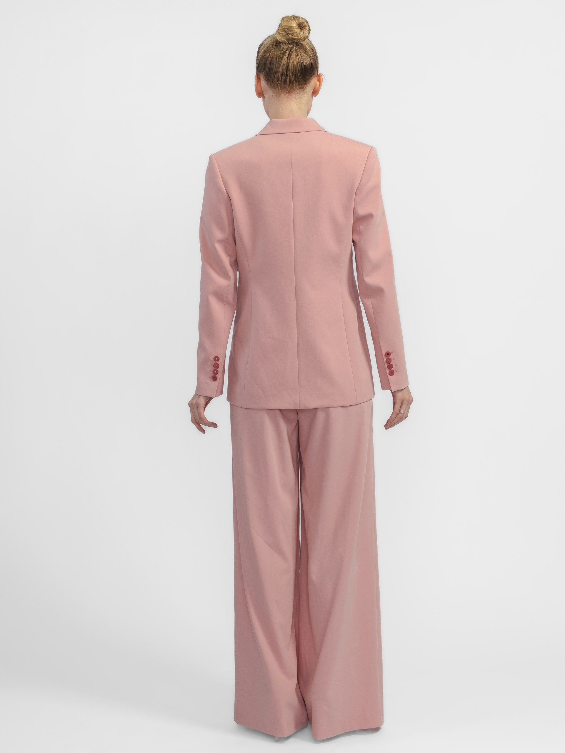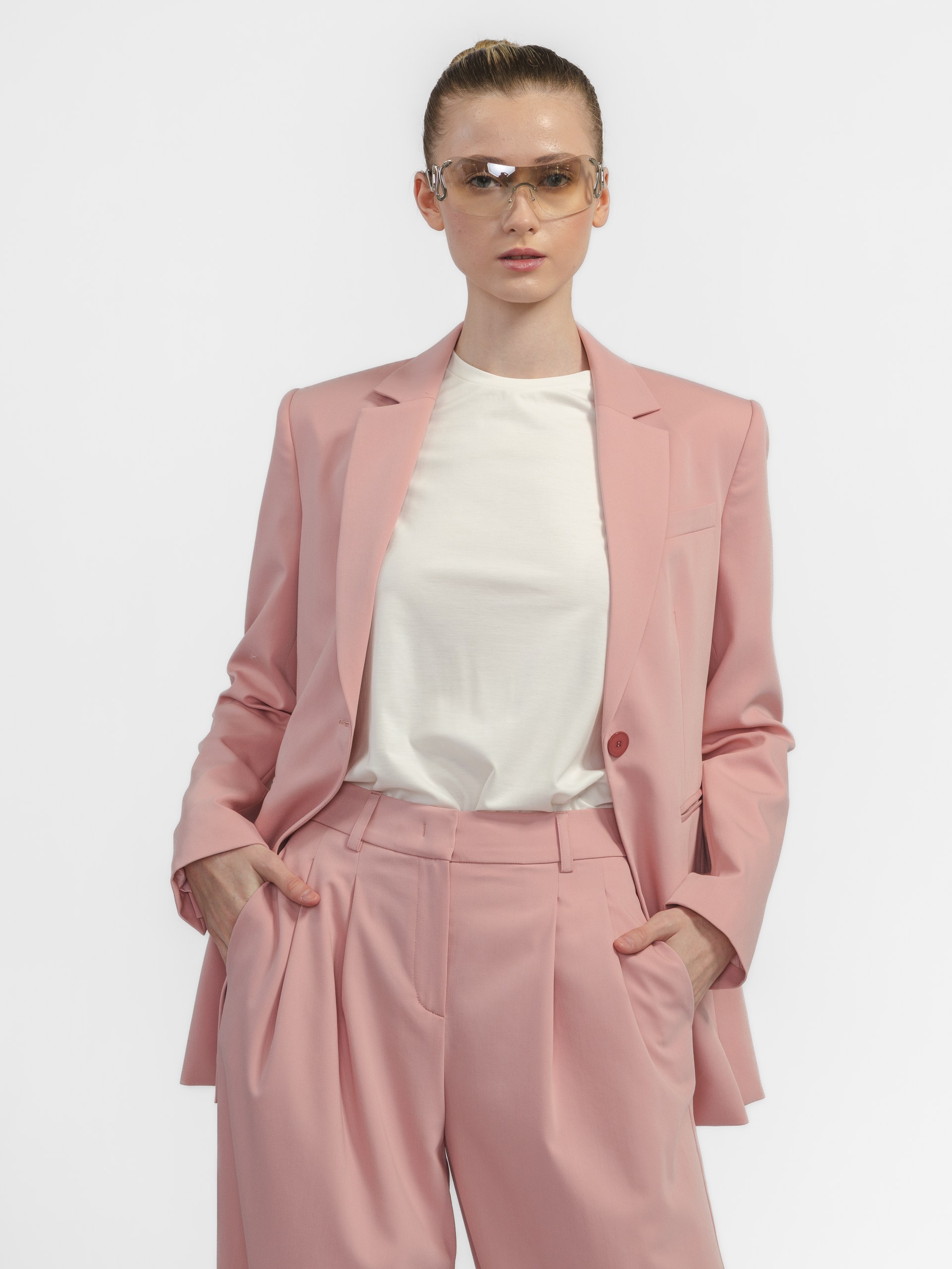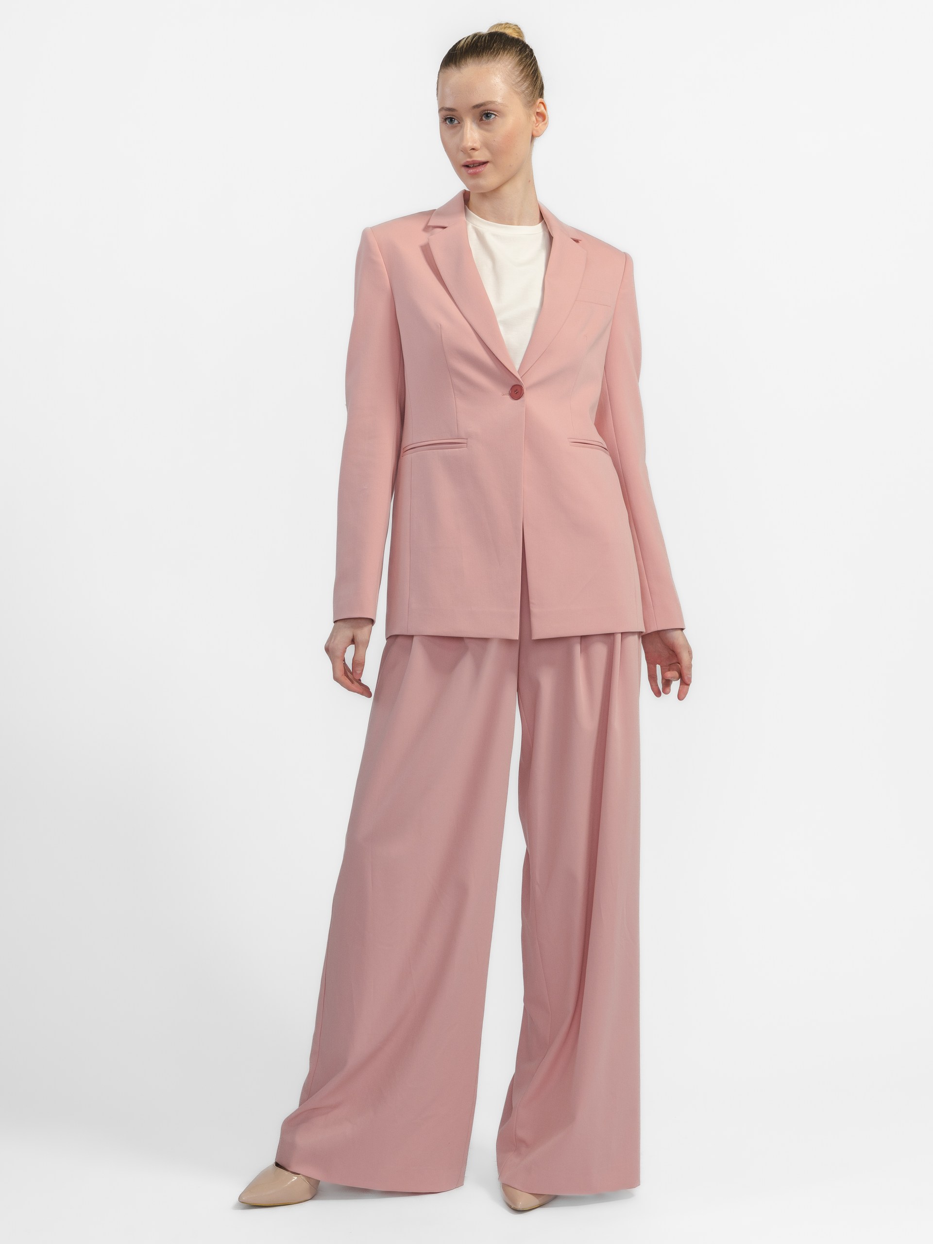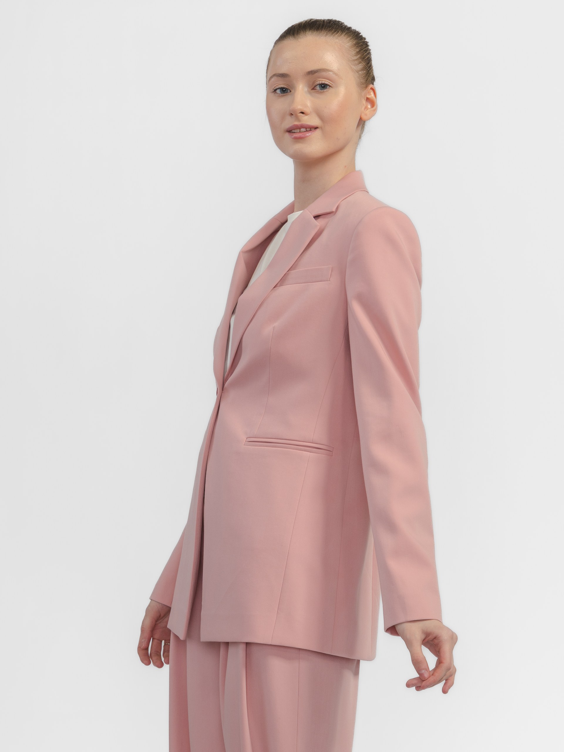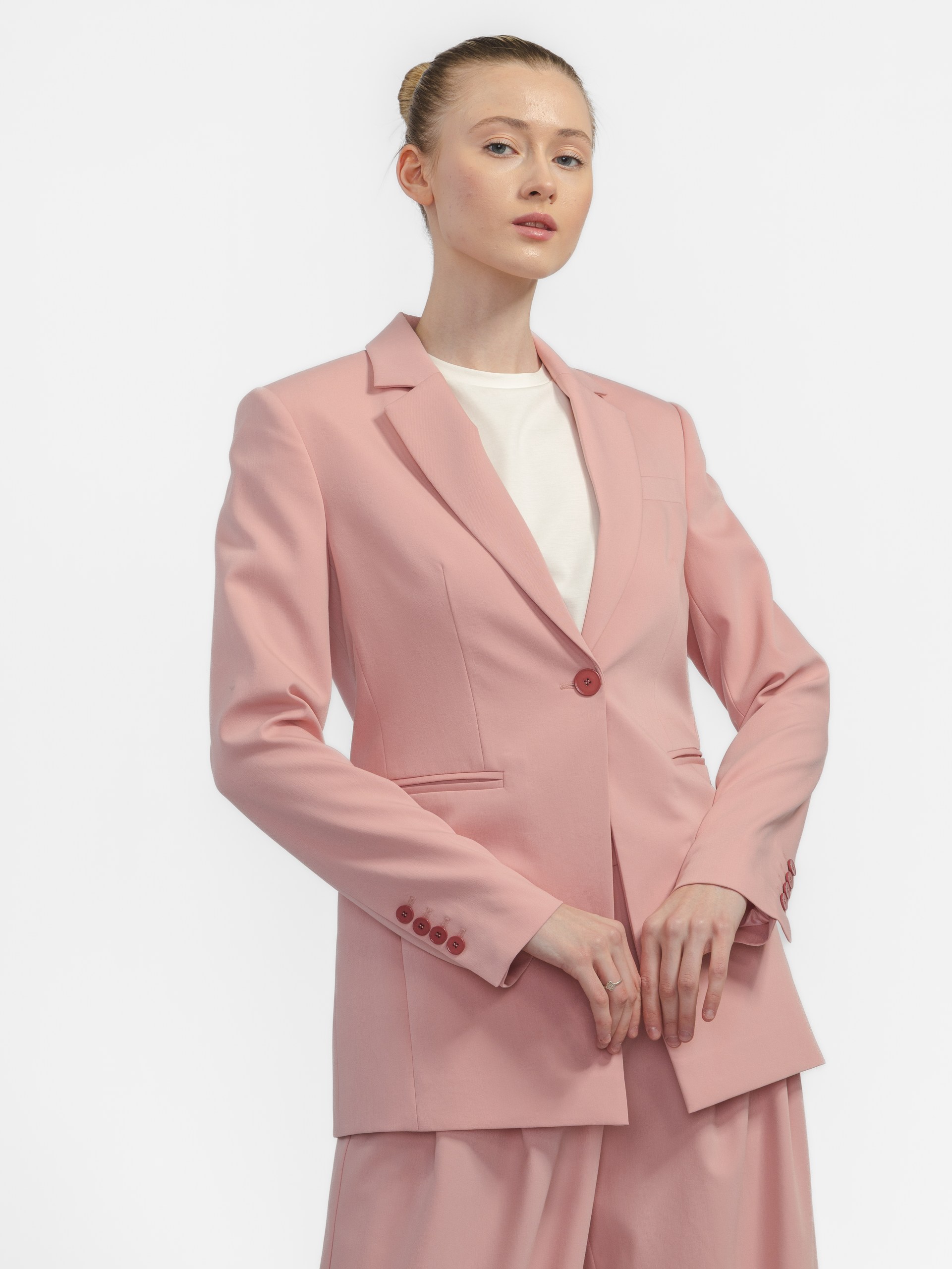Комфортный жакет на одной акцентной и высокой пуговице создаёт безупречную линию плеч.
